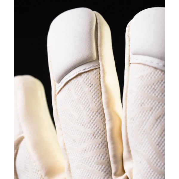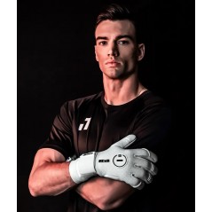 A extensão tubular do dorso adapta-se naturalmente ao punho, proporcionando ajuste firme e anatómico. Inclui ainda uma faixa elástica de suporte na base da luva, garantindo estabilidade e mantendo a luva segura durante todo o jogo, sem comprometer a mobilidade do punho.